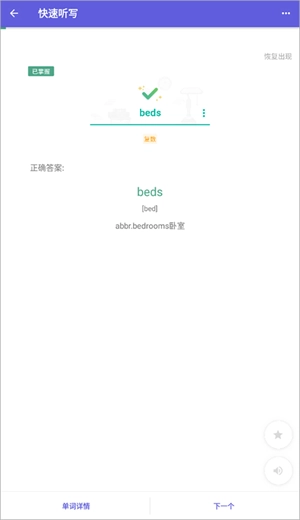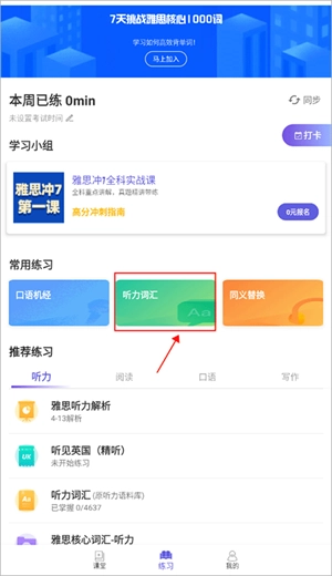 针对雅思核心高频词汇设计记忆与应用练习,结合具体语境深化理解,提升词汇在实际场景中的运用准确度。1、首先我们打开,在练习界面找到“听力词汇”