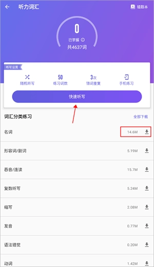2、在快速听写开始前,需要先准备好单词语音包,并在下方选择你想要听写的内容。