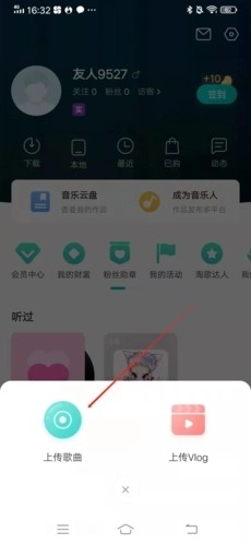 2、在弹出窗口中,点击“上传歌曲”,如果是视频,也可以点击“上传Vlog”;