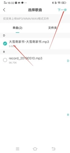3、选择想要上传的歌曲作品,选择完毕后,点击右上方“下一步”;