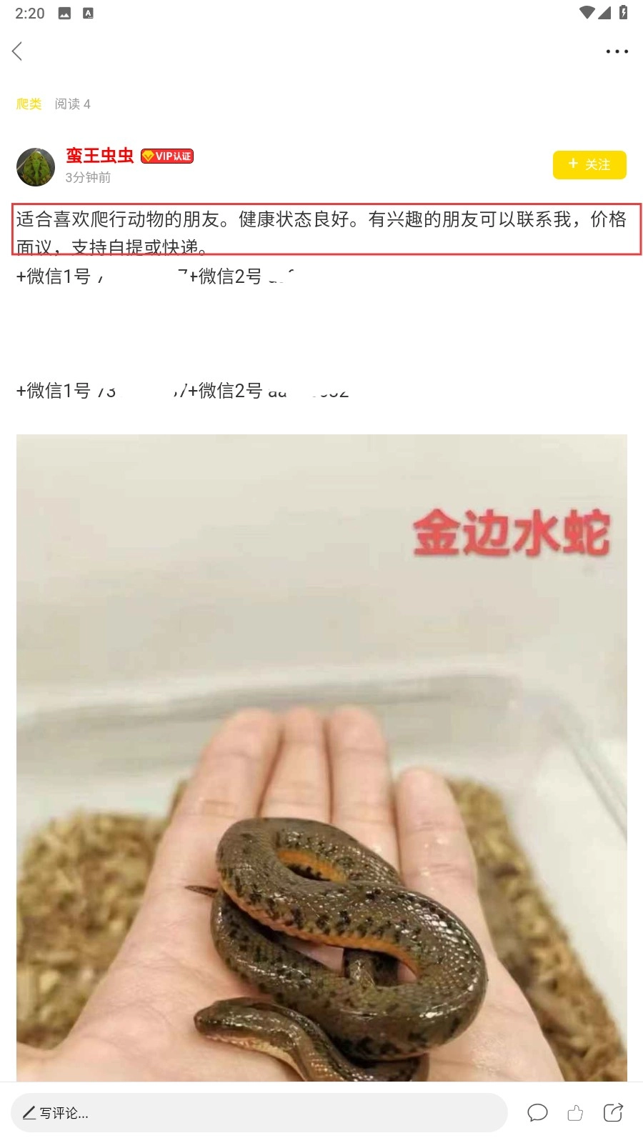 4、进入蛇类话题页面后,能查看用户发布的蛇类相关帖子及其详情,添加对方微信联系方式进行交易即可。