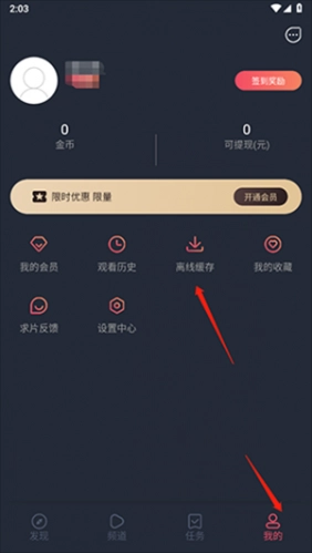 3、点击“我的”,再选择“离线缓存”选项,就能进入页面查看自己缓存的视频内容。