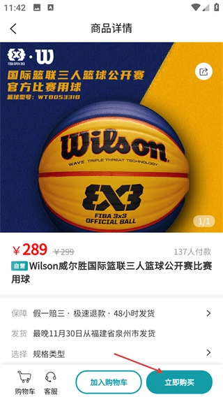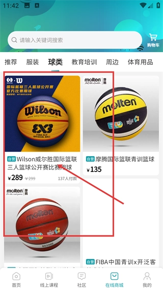 3、在球类商品列表里,能挑选目标商品(例如【Wilson威尔胜国际篮联三人篮球公开赛比赛用球】),点击即可进入商品详情页面。