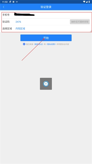 3、在验证登录页面,输入账号、验证码,选择所在区域后,点击【开始】按钮,即可完成验证并启动租车流程。