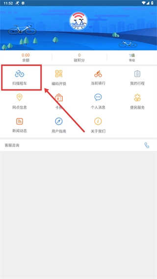 2、在主界面,点击【扫码租车】功能入口,进入租车验证流程。