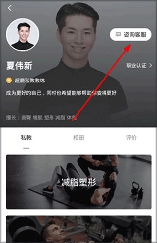 最后查看这位私人指导的详细资料页面,然后点击页面右上角的客服联络按钮来完成预约。