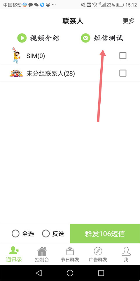 7、[便捷高效]无需借助电脑,也无需上传通讯录,只需一键操作,即可向通讯录中的所有号码或分组联系人号码进行短信群发。