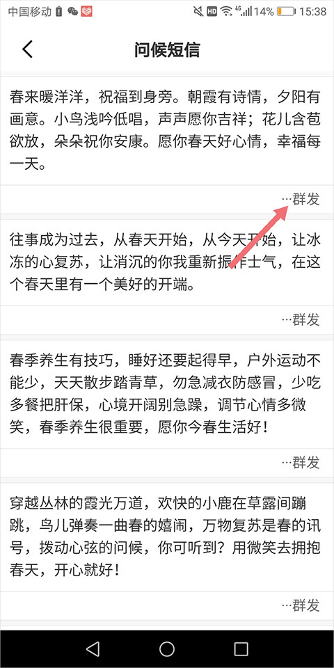 6、若用户有文案服务需求,可前往【节日群发】或【广告群发】板块查找文案,找到合适的文案后,点击其下方的【群发】按钮即可。