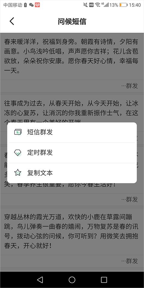 7、在弹出的选项里,你可以直接选择群发,也能复制文本进行二次编辑。