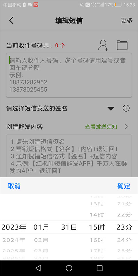 6、[定时群发]支持两种发送方式:一是立即群发,二是选择定时群发,可用于发送各类节日祝福短信、开业广告短信等内容。