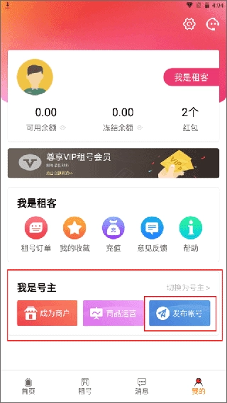 1、首先进入优号租首页,切换至【我的】功能模块界面,该界面包含租客与号主两种身份选项;若需发布账号信息,点击右侧的“发布账号”按钮即可。