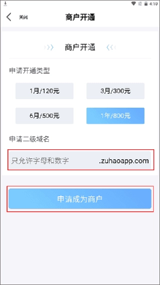(3)接下来是申请你网站的二级域名,按照提示输入你已经确定好的名称,然后点击“申请成为商户”按钮,之后等待工作人员的审核通知就行。