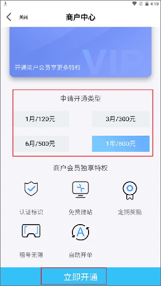 (2)你挑选好要申请开通的类型,熟悉商户会员专享的各项特权后,点击“立即开通”按钮即可。