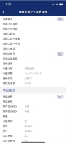 点击订单编号,即可进入跨境电商个人消费详情页面,在该页面能查看这票单据的通关状态、税款信息等详细内容。另外,您可以点击“物流运单号”旁边的“复制”按钮,复制单号后前往快递公司平台查询物流进展。