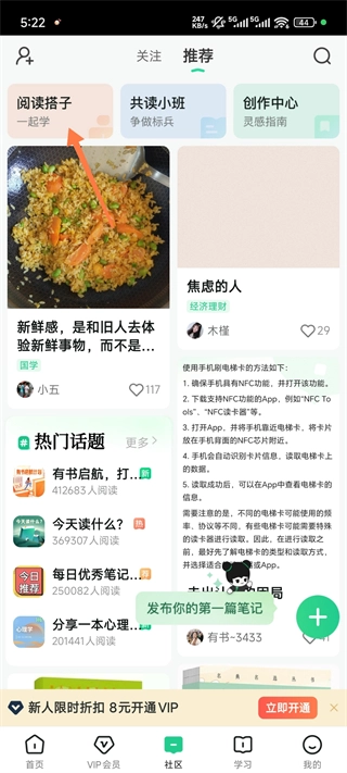 2、首页点击下栏社区,进入后点击“阅读搭子”。