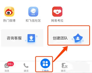 打开软件后,点击“工作台”,接着下拉页面至底部,再点击“创建团队”。