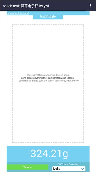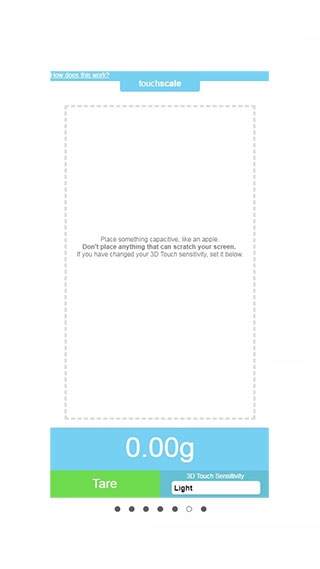 touchscale是一款便捷实用的屏幕称重辅助工具,该软件借助先进的3D触控技术,能把屏幕转化为便携式电子秤。只要将需要测量的物品放在支持3D触控的屏幕指定区域,就能迅速获取物品的重量数据。touchscale的操作十分简便,只需打开软件后,把重物放置在屏幕上即可,称重数值范围精准度高,误差较小,实用性很强。