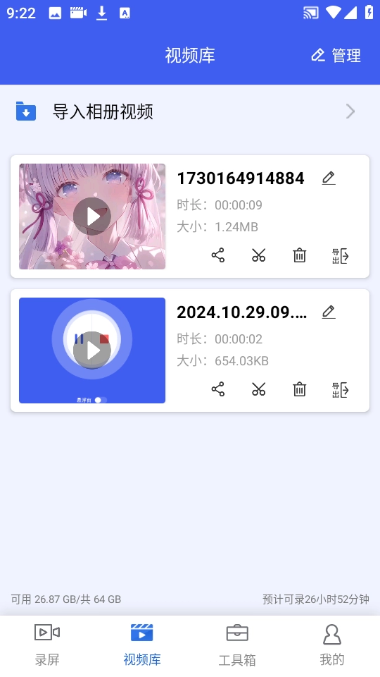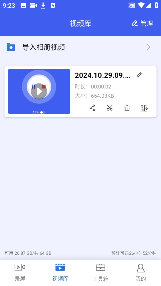 5、此时我们点击下方的“视频库”,就能看到刚录制完成的视频内容,该功能支持分享和删除操作。