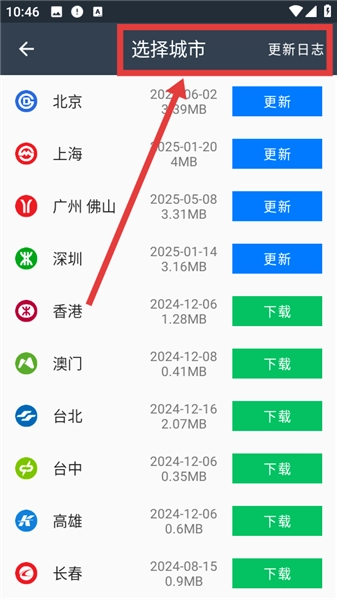 在城市界面上,可以看到北京、上海等多个城市的列表,每个城市都标注了数据更新日期和大小,并且配有更新或下载按钮。界面顶部设有更新日志查看入口,用户能够便捷地选择所需的城市轨道交通数据。