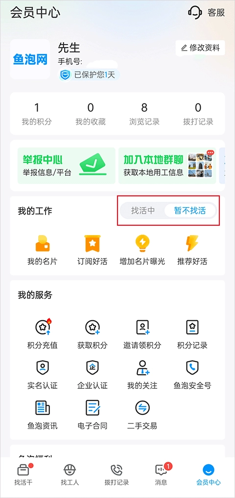 点击右下角【会员中心】--【我的工作】。