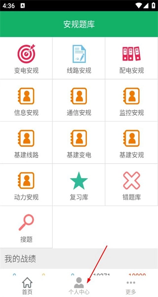 打开安规题库后,进入软件首页,看到变电安规等多个分类,点击个人中心。