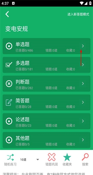 注册完成后进入变电安规板块,能看到单选题、多选题等不同题型的分类,你可以选择相应题型开始进行练习。