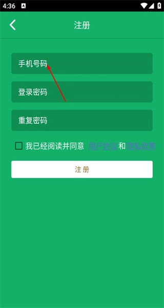 在注册界面,填写手机号码,设定并再次输入密码,勾选相关协议后即可完成注册步骤。