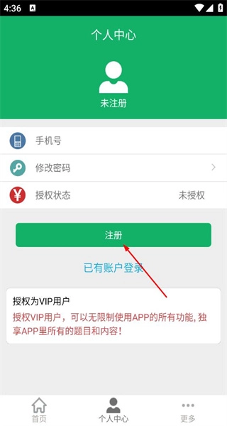 在个人中心页面,点击注册按钮后会跳转至注册界面,该界面需要填写手机号码并设置登录密码。