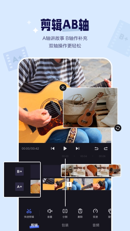 1、【简单易用的剪辑功能】包含分割、变速、画中画等多种剪辑能力,助力视频制作更轻松简单。