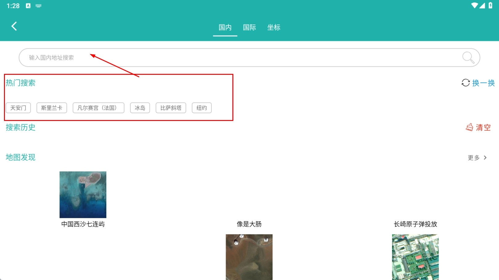 2、在搜索页面,你既可以在输入框中输入国内地址进行搜索,也能够点击热门搜索区域里的地点,比如天安门。