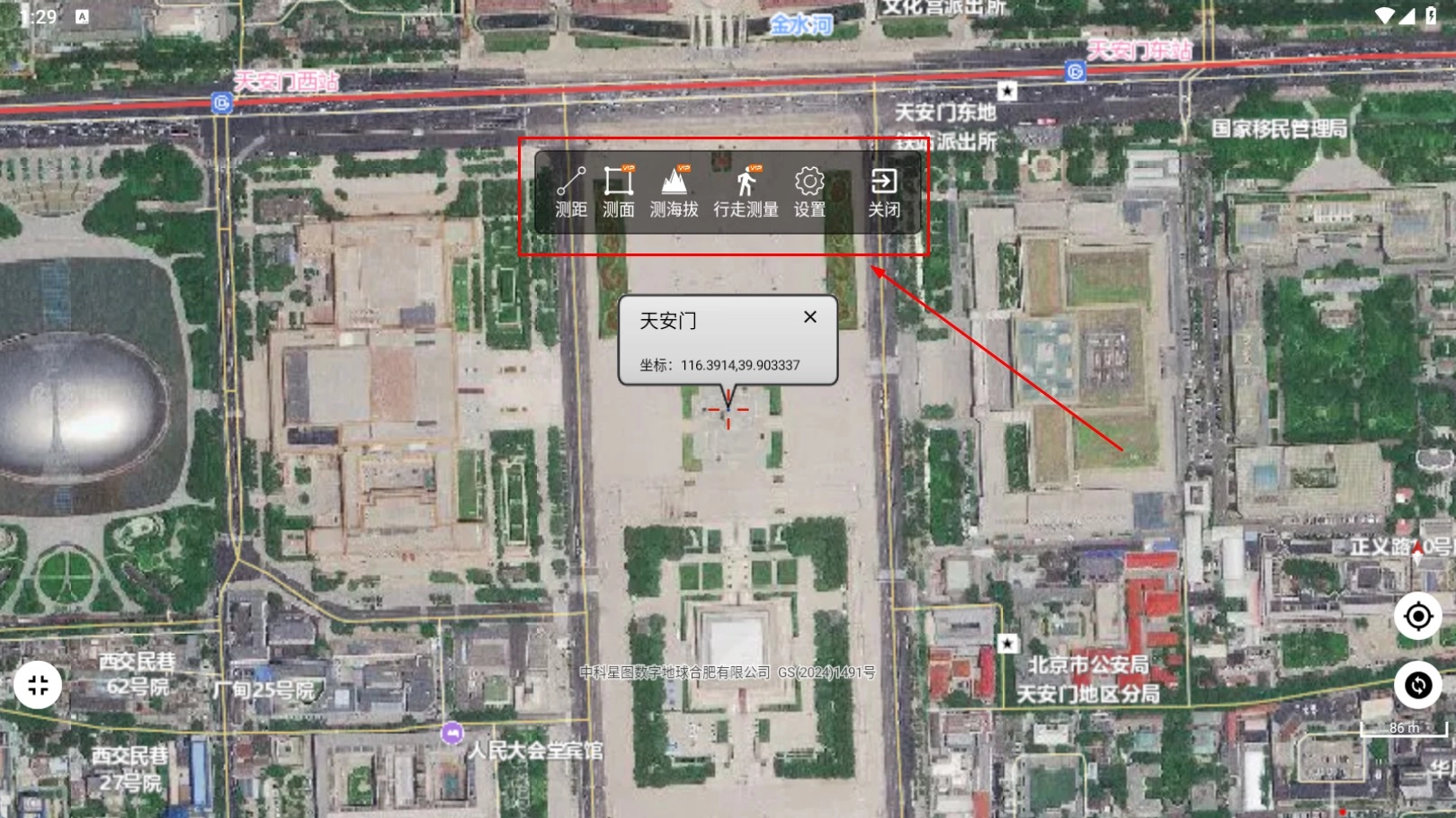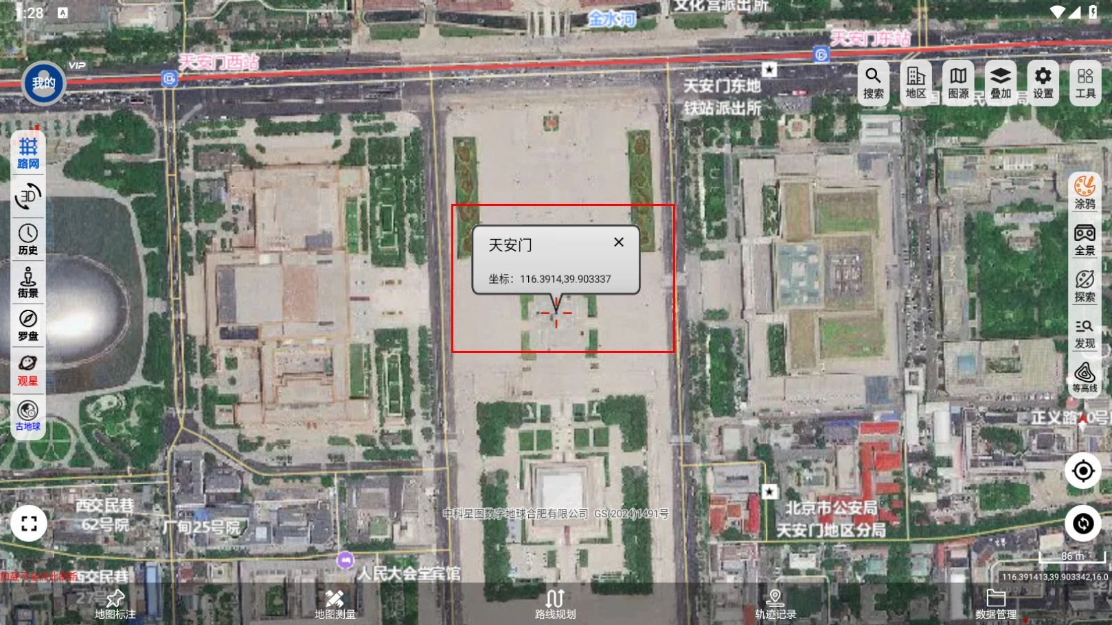 3、完成搜索后,能够查看地点的坐标信息,例如天安门的坐标是116.3914,39.903337。