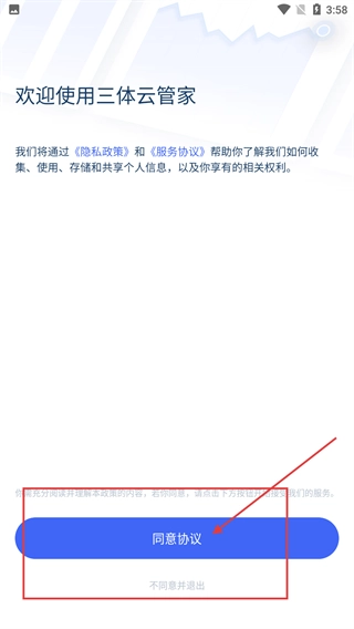 1、打开三体云管家后,会弹出隐私政策与服务协议的提示,点击【同意协议】按钮,就能继续使用该软件。