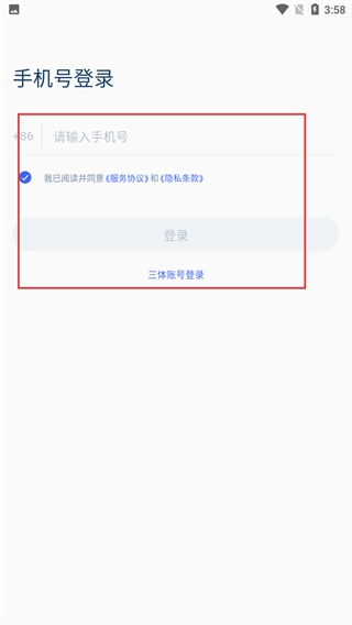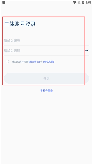 3、若选择三体账号登录,进入三体账号登录界面后,输入账号和密码,勾选“阅读并同意相关协议”选项,再点击登录按钮即可完成登录操作。