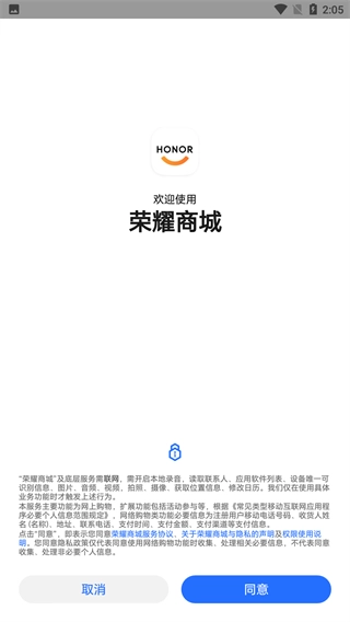 打开荣耀商城后,页面会弹出隐私政策提示,阅读完毕后点击【同意】按钮,就能进入商城首页。