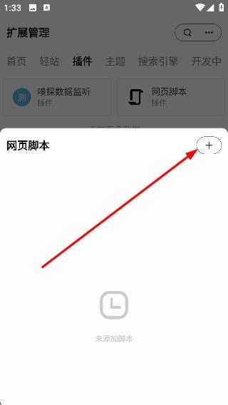 3、在网页脚本管理页面点击【+】按钮,展开脚本添加选项列表。