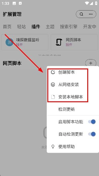 4、在脚本添加选项列表中,可选择【创建脚本】【从网络获取】【本地脚本导入】等操作,以完成网页脚本的添加或创建。