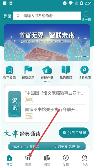 1、在该阅读类应用的首页,点击底部的【资源】选项,即可进入资源板块。