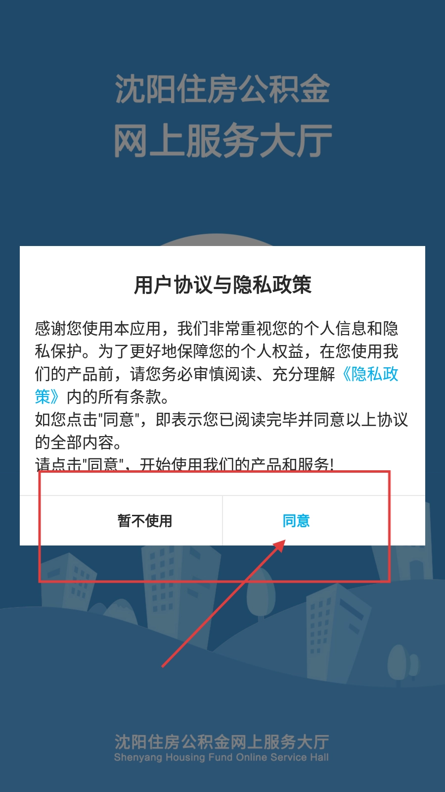 使用沈阳住房公积金网上服务大厅时,阅读相关内容后点击【同意】按钮即可进入应用。