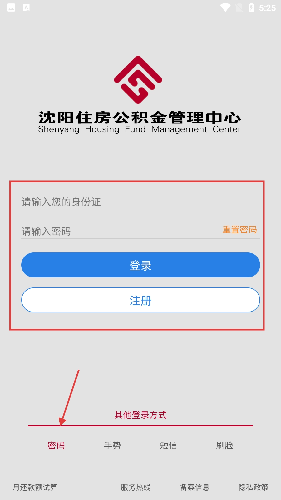 2、您可以选择密码登录的方式,输入身份证号与密码后点击【登录】按钮即可;如果没有账号,可点击【注册】按钮进行账号注册。