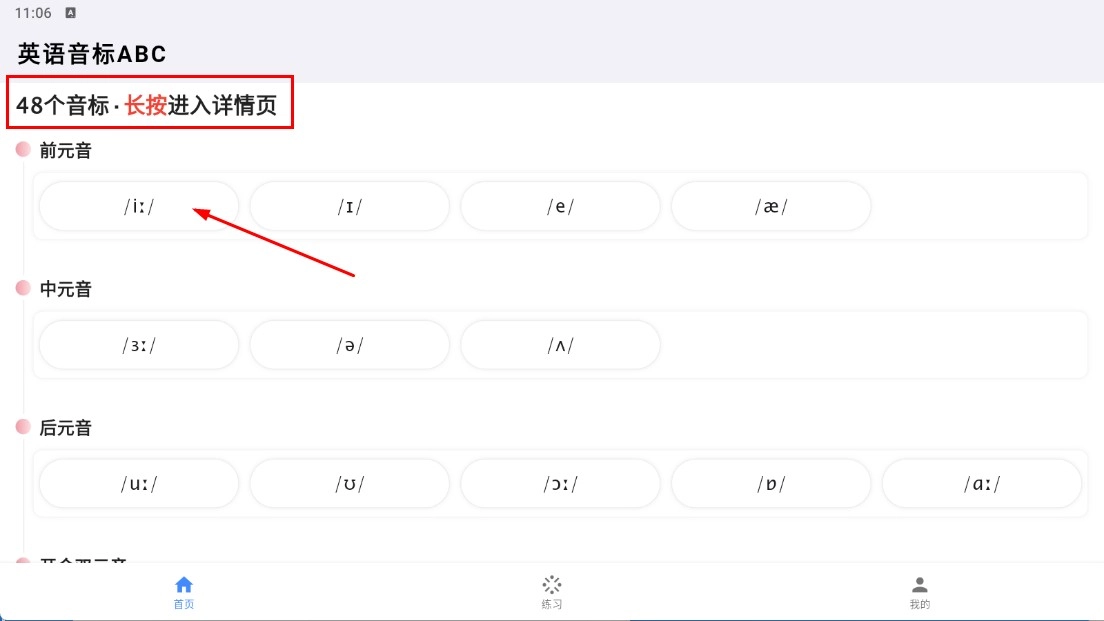 3、长按【48个音标-板块入口】,进入音标详情页后,就能查看各类音标,像前元音【/iː/-音标标识】这类都可以看到。