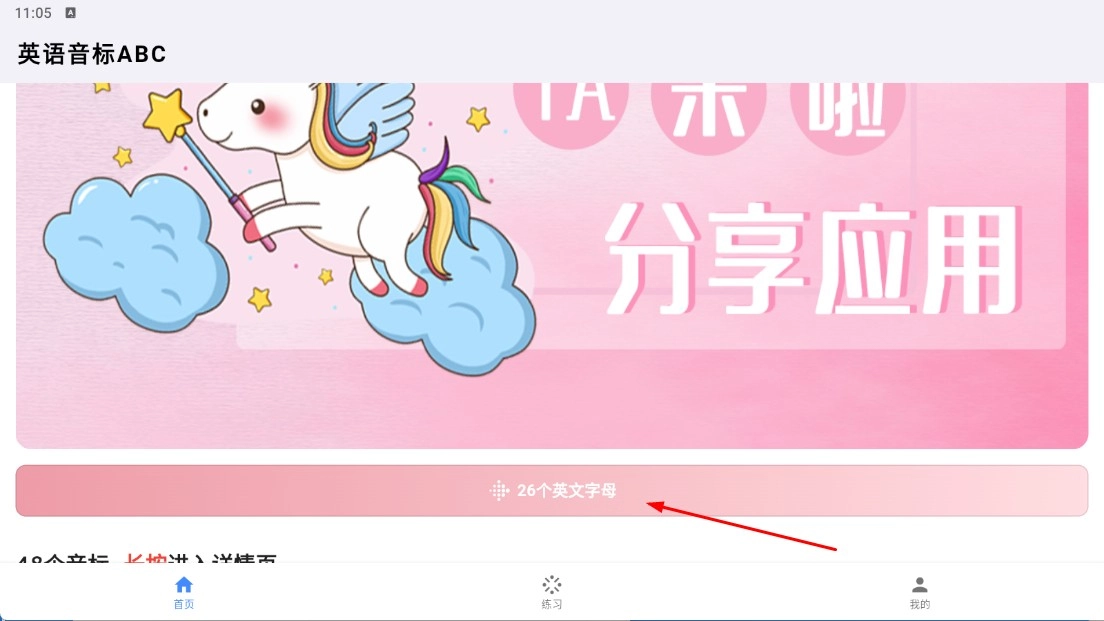 1、点击【26个英文字母-功能入口】,进入字母学习页面。