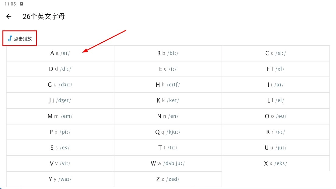 2、进入字母学习页面后,点击【点击播放】功能按钮,即可学习字母发音,例如【Aa/eɪ/】这类字母音标展示形式。
