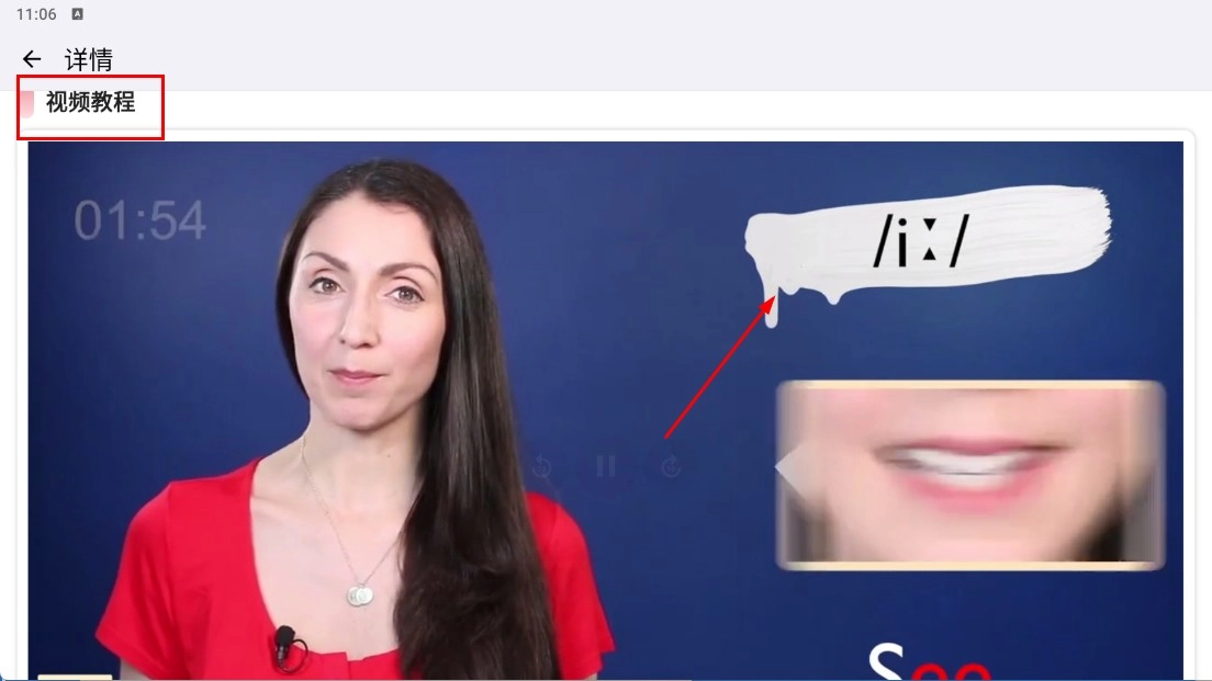 4、进入音标详情页后,可通过【视频教程-功能板块】学习音标发音,例如【/iː/-音标标识】的发音技巧。