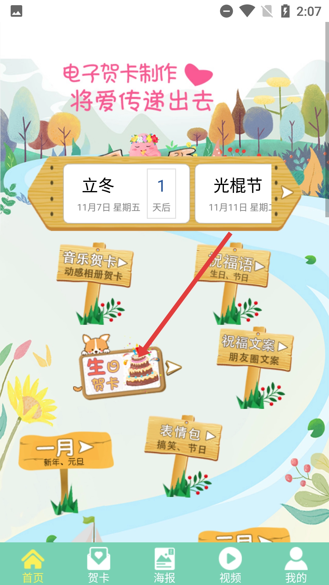 1、在首页选择【生日贺卡】选项,进入生日贺卡制作分类页面后,能够查看各类节日的倒计时信息以及贺卡分类的入口。