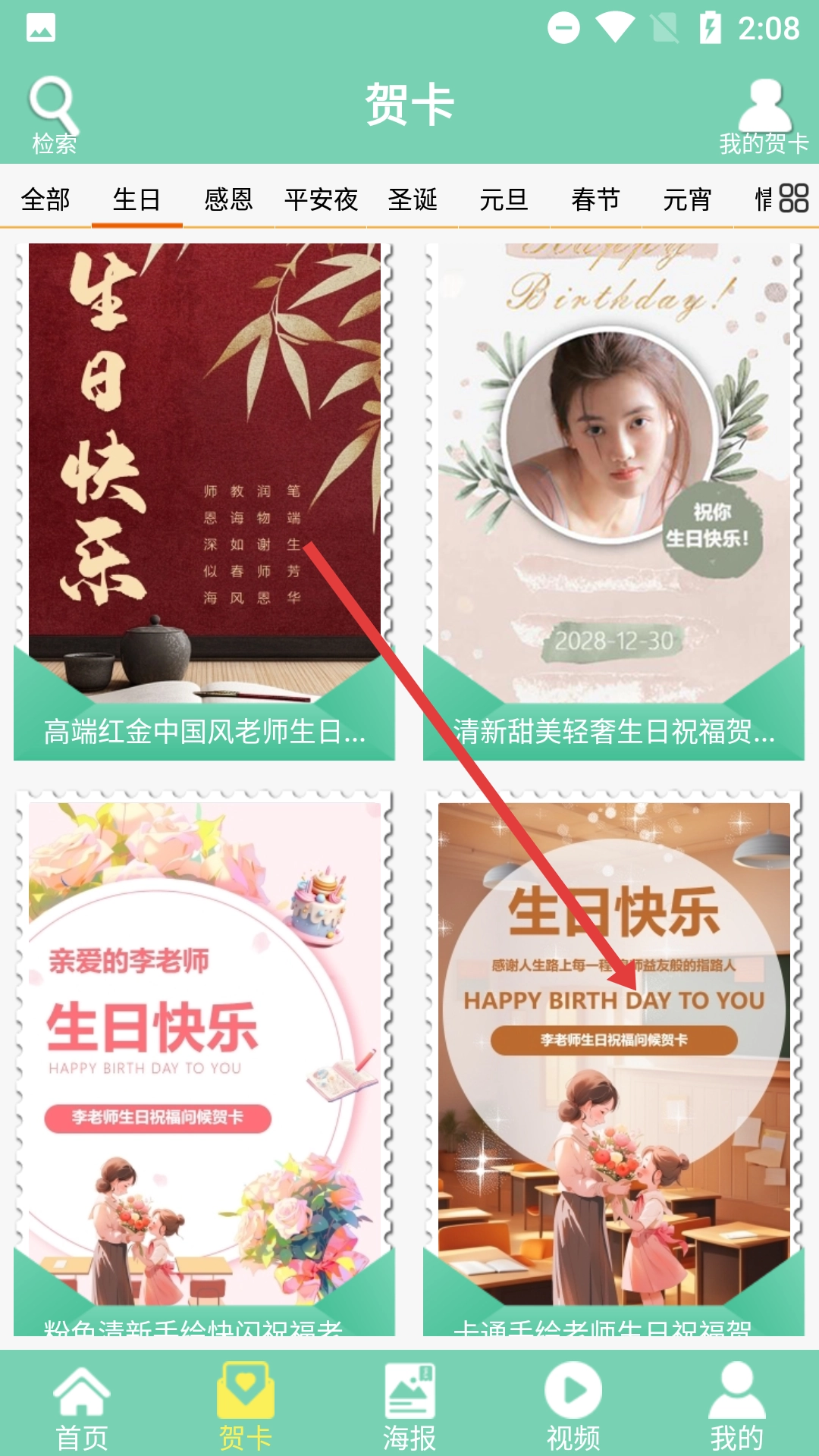 2、在贺卡页面选择【生日】分类,然后点击自己喜欢的贺卡模板,比如高端红金中国风老师生日贺卡,接着进入该模板的详情页。