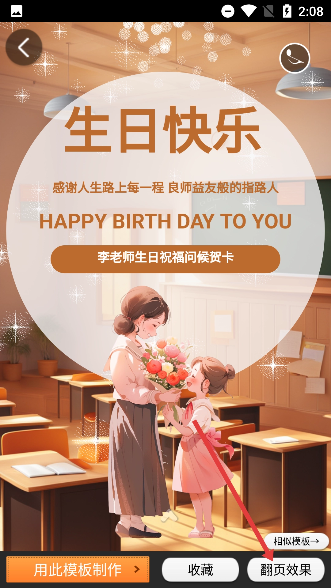 3、在贺卡模板的详情页面中,点击【翻页效果】按钮,就能预览各种不同的翻页效果,从而为贺卡增添动态展示的效果。