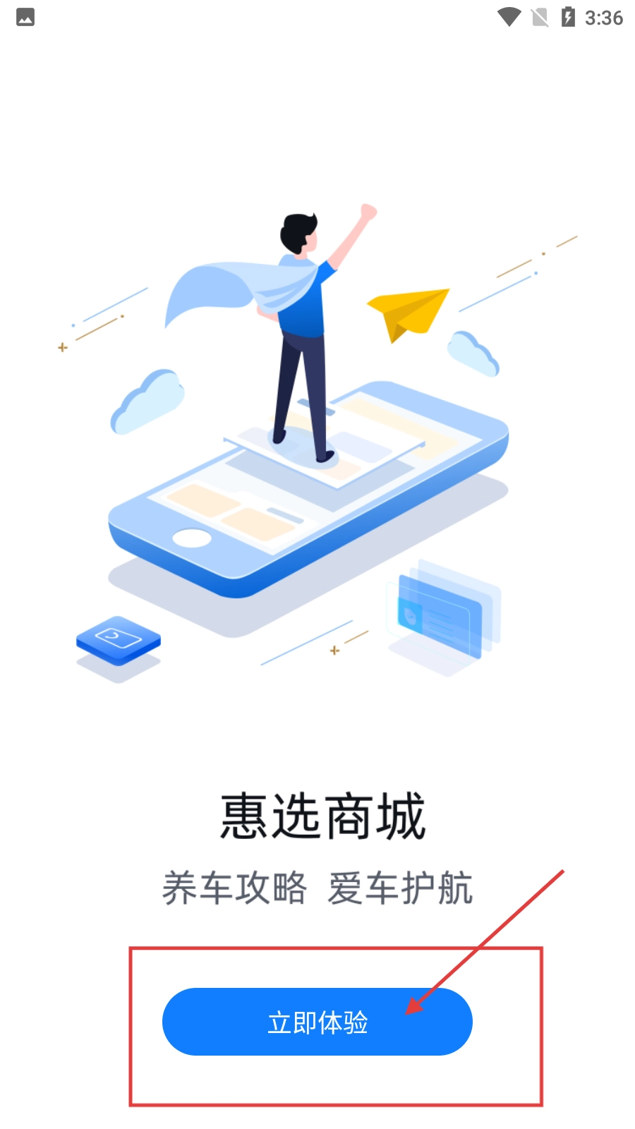2、如果存在【惠选商城】模块,您可以点击【立即体验】进入该模块,从而获取养车攻略等相关服务。