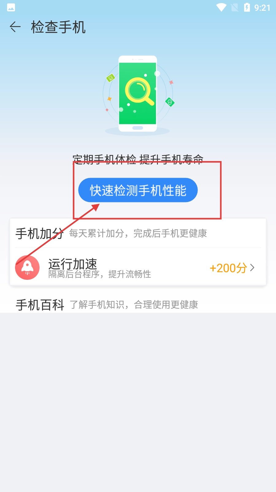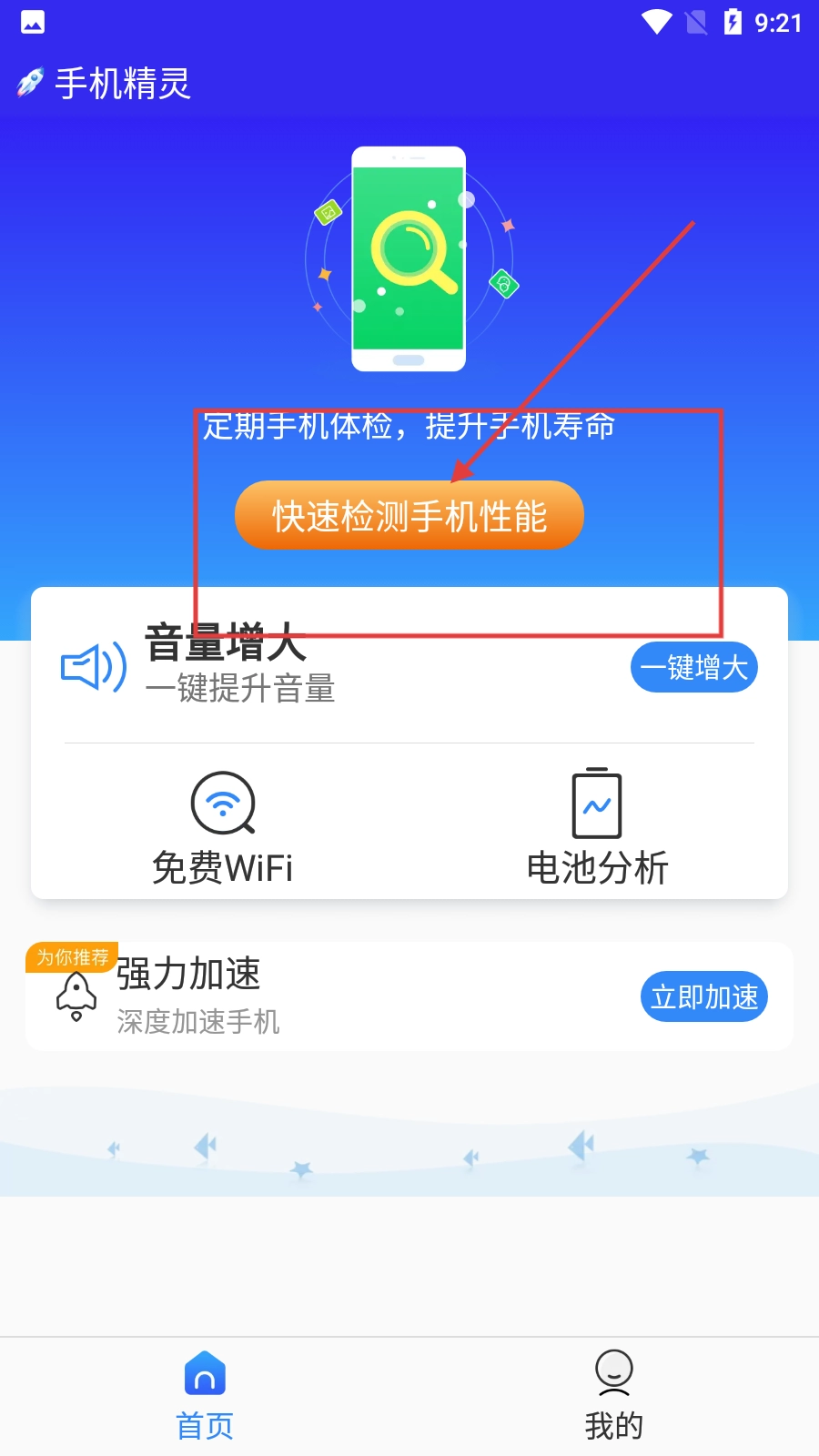 1、在【精灵】首页,点击【快速检测性能】按钮,即可启动性能检测流程。