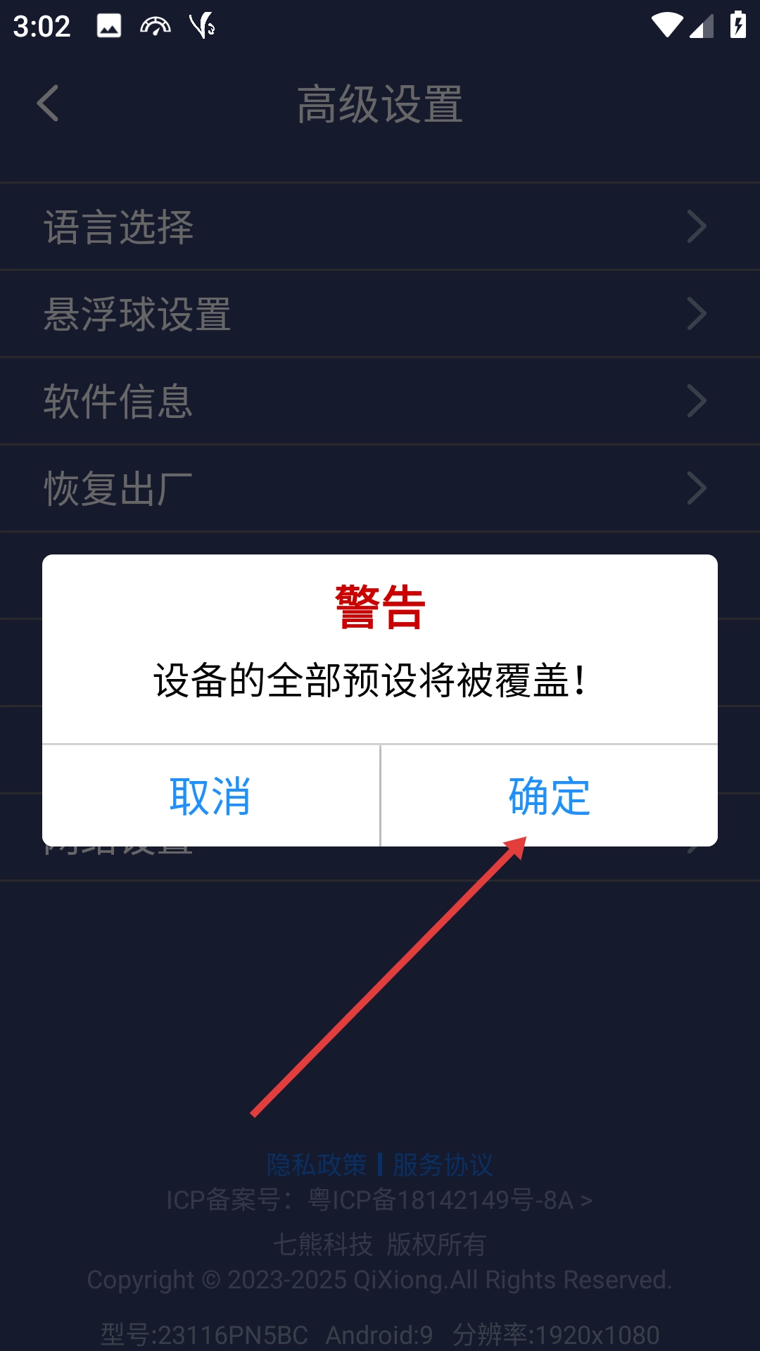 4、在警告确认框中点击【确定】按钮,以执行恢复出厂设置的操作。