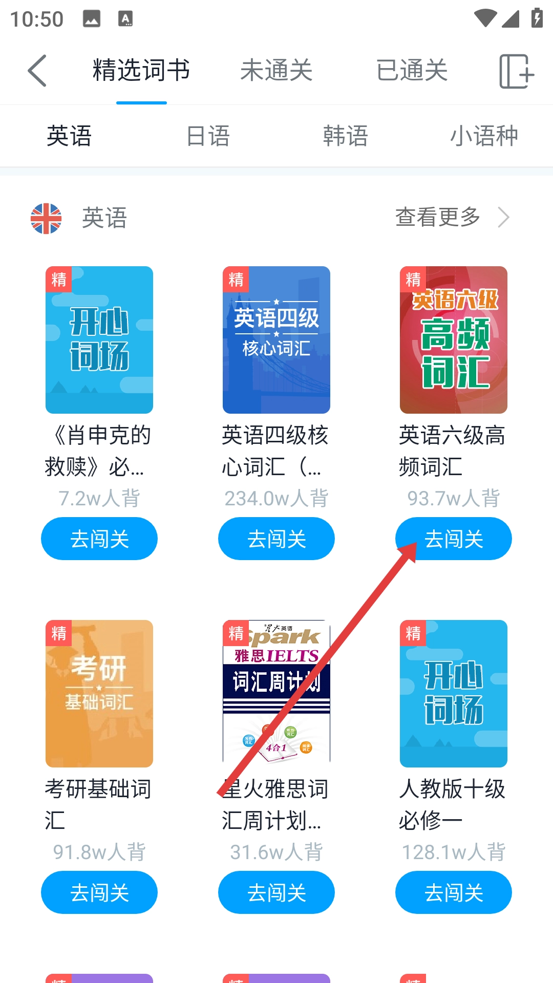 在精选词书页面找到【英语六级高频词汇】,点击对应的【去闯关】按钮,就能把该词书添加到“我的词书”中。